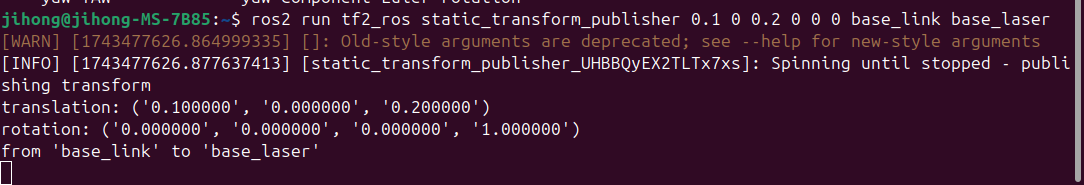 - 여기에서는 TF 2가 제공하는 static_transform_publisher를 이용하여 간단한 transform을 publish해본다.