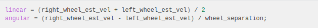 - right_wheel_est_vel , left_wheel_est_vel는 휠 속도이며, wheel_separation은 휠 간의 거리이다.