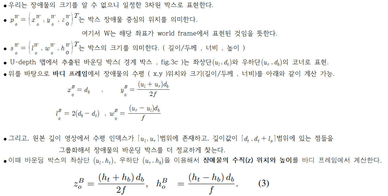 그리고 카메라의 깊이 영상을 기반으로 장애물의 위치와 크기(길이/두께, 너비, 높이)를 탐지한다. - 장애물의 길이/두께, 너비, 그리고 수평 위치(x, y 좌표)는 먼저 U-depth 맵(Fig. 3c)에서 추출되고,