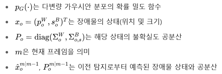 - 이동 장애물 회피를 위해, 장애물의 미래 위치와 공분산은 등속도 모델을 이용해 예측한다... (식 6)