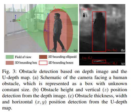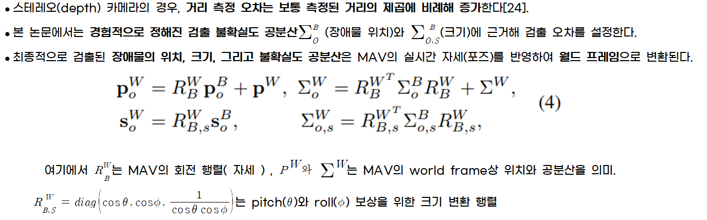 - 장애물 감지를 위해서는, 장애물을 3차원 타원체(ellipsoid)로 모델링하고, 깊이 이미지를 기반으로 한 효율적인 장애물 탐지 및 추적 방법을 적용하여 장애물의 크기, 위치, 속도 및 이와 관련된 불확실성을 획득한다.