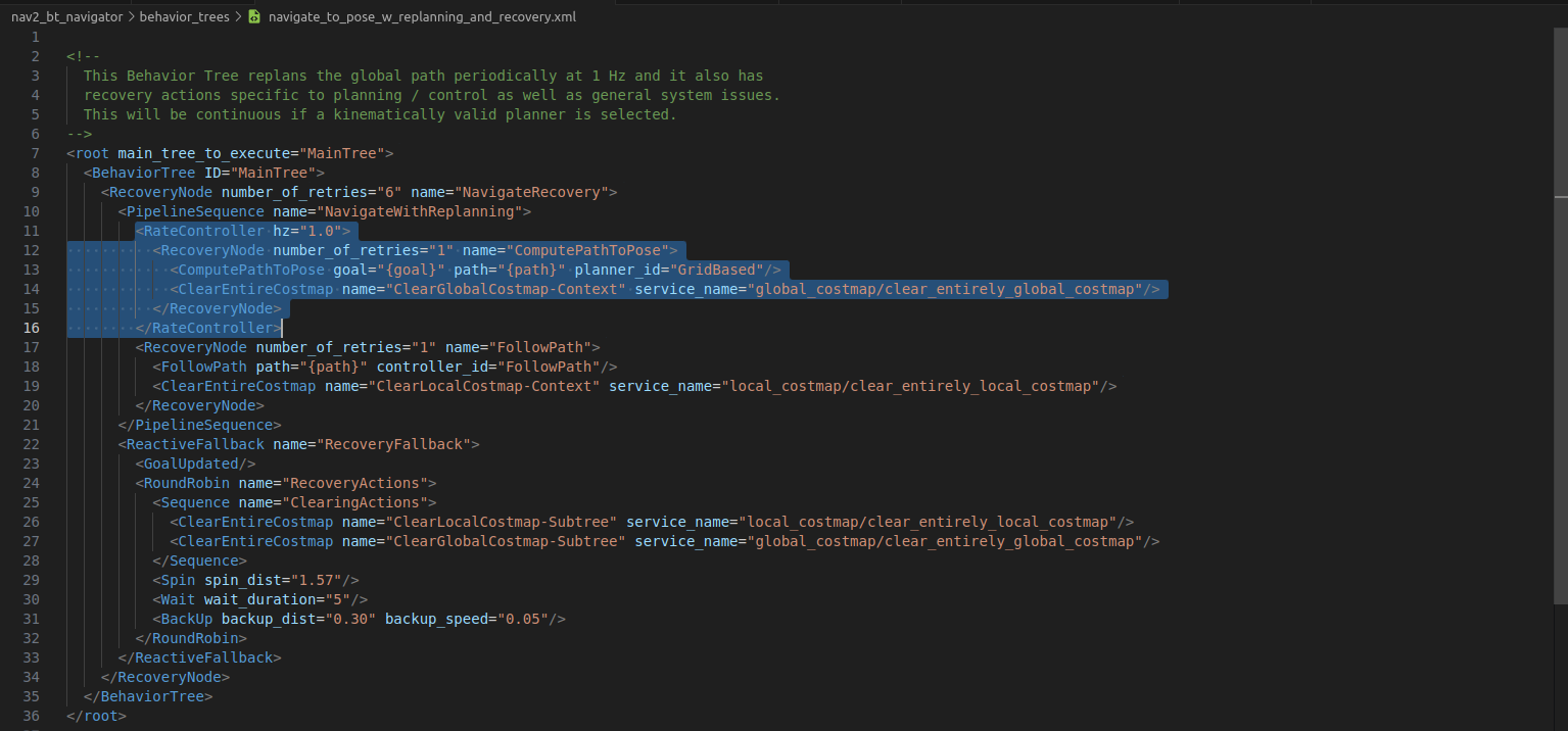 - 그중 RateController hz="1.0"이 핵심이다. 이것의 의미는 1초에 1번 computePathToPose 노드가 실행된다.