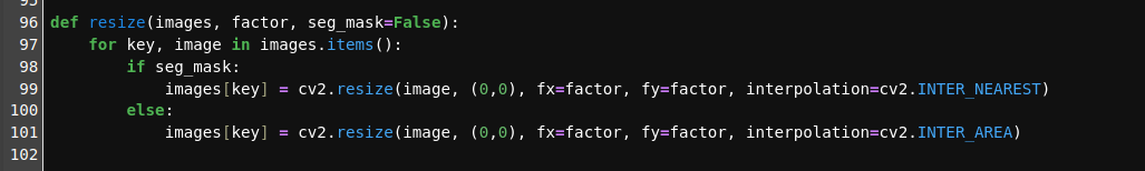 - line 58 : resize( vis_images , factor=params['resize'] , seg_mask=False )
